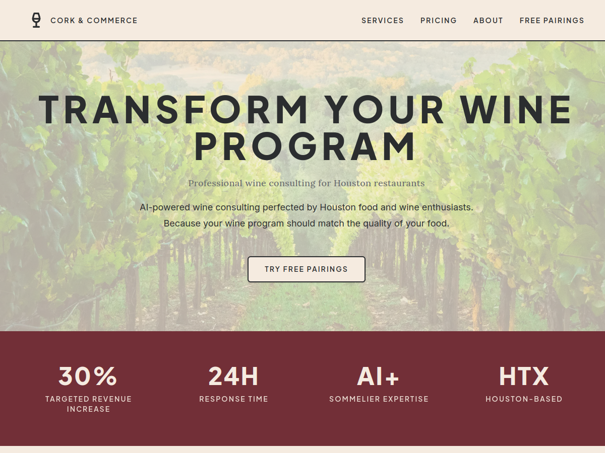 - Shares the wine-consulting backend with Cork Commerce: Next.js App Router API routes, Supabase auth/Postgres, Trigger.dev jobs, and Cloudflare Workers for heavier AI pairing work.
